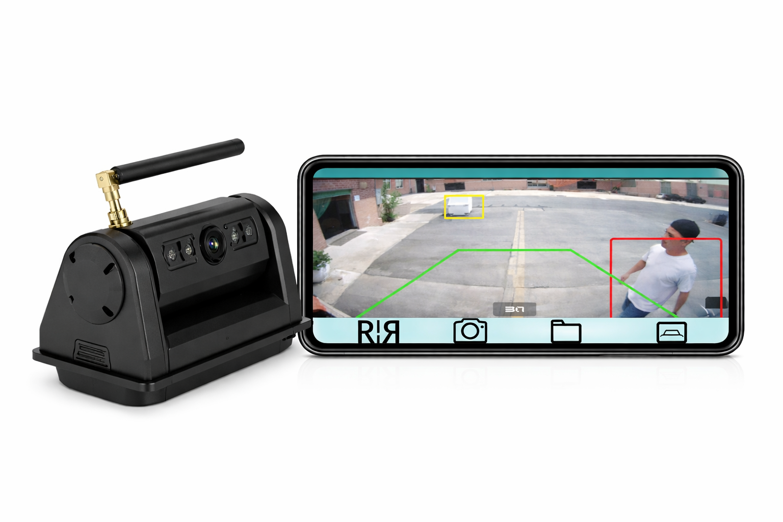 Pažangi belaidė kamera su AI (BSD – aklųjų zonų aptikimo) funkcija ir integruota baterija. Vaizdą galite stebėti tiesiogiai savo telefone ar planšetėje – be papildomo monitoriaus.